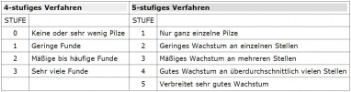 Somit stellt sich die Frage, ob ausreichend zuverlässige Daten des Pilzwachstums auch mit einer rein visuellen Bewertung des Wachstums gewonnen werden können. Voraussetzung für eine solche Bewertung kann eine qualitative Bewertungsskala unter Definition von „Wachstumsstufen“ sein. Eine solche Skala könnte -