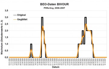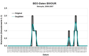 Auch wenn es sich um die besten dem Projekt verfügbaren Beobachtungsdaten handelt: Anlass für diese Fragen ist die Tatsache, dass die durchgeführten Pilzerfassungen lediglich Momentaufnahmen des Pilzwachstums darstellen und das tatsächliche Pilzaufkommen deshalb nicht vollkommen zuverlässig wiedergeben können. Lücken in den Zeitreihen können durch fehlende Erfassungsgänge oder auch durch vorherige Entnahmen anderer Pilzsammler hervorgerufen werden. Insbesondere im Fall der trockenresistenteren Pfifferlinge dürften auch bei hoher Trockenheit z.B. keine Lücken von nur wenigen Tagen in den Beobachtungsdaten auftreten. In der Projektgruppe herrschte deshalb Übereinstimmung darüber, dass nicht die Rohdaten selbst, sondern angemessen korrigierte Daten als Beobachtungsdaten der Pilzhäufigkeit verwendet werden sollten. Deshalb lag eine Interpolation der erfassten diskreten, zwischen 0=keine Pilze und 3=viele Pilze liegenden Werte durch ein entsprechendes Verfahren nahe.