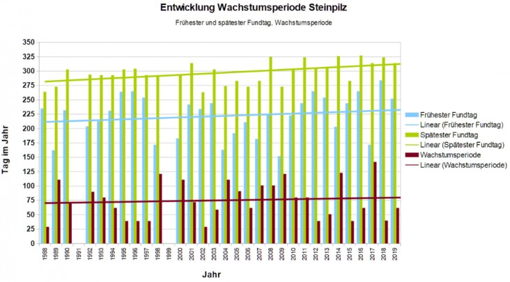 Verantwortlich für die in dargestellten Veränderungen des Pilzwachstums sind auch Änderungen der Wachstumsandauer als Folge des Klimawandels. Diese Änderungen sollen an Hand der Entwicklung des frühesten und spätesten Fundtages sowie der Länge der Wachstumsperiode demonstriert werden. Dazu sind nachfolgend die für jedes Jahr der Gesamtperiode ermittelten Werte dieser Größen samt linearem Trend dargestellt.