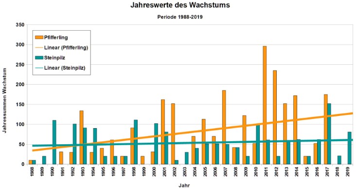 Danach hat sich das Wachstum der Pfifferlinge am Fundort Potsdam zwischen 1988 und 2019 von etwa 34 auf 126 erhöht (aufsummierter interpolierter Bonitätswert), das der Steinpilze lediglich von etwa 46 auf 61. Ebenfalls durchgeführte Analysen auf Monats-