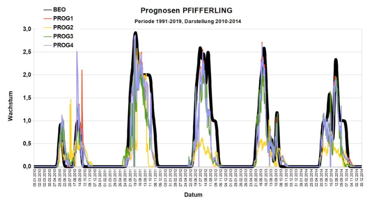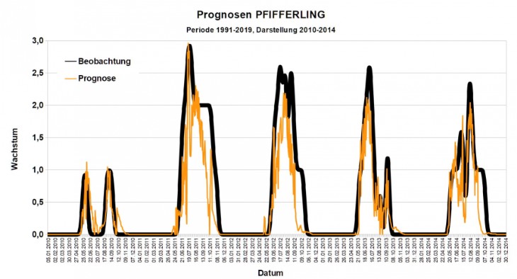 Beobachtetes und berechnetes Wachstum von Pfifferlingen, dargestellt für die Periode 2010-