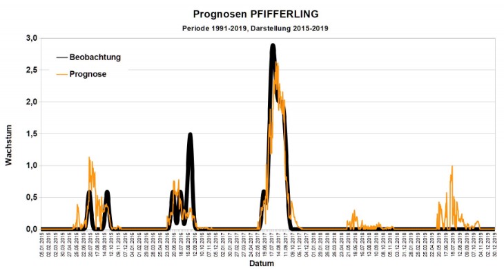Beobachtetes und berechnetes Wachstum von Pfifferlingen in der Periode 2015-