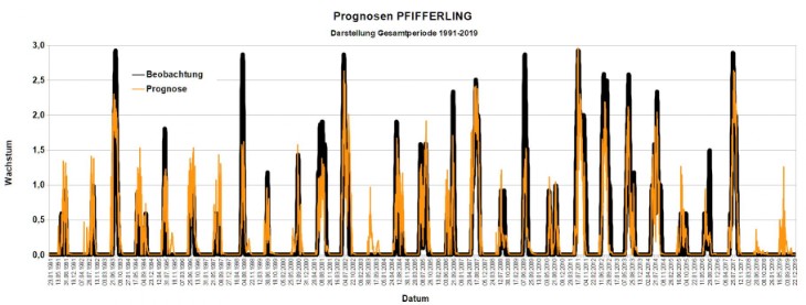 In der folgenden Abbildung ist zunächst das Ergebnis der Prognoserechnung für Pfifferlinge für die Gesamtperiode 1991-