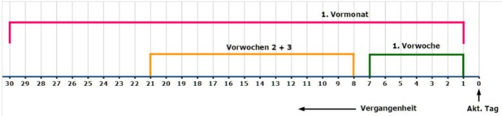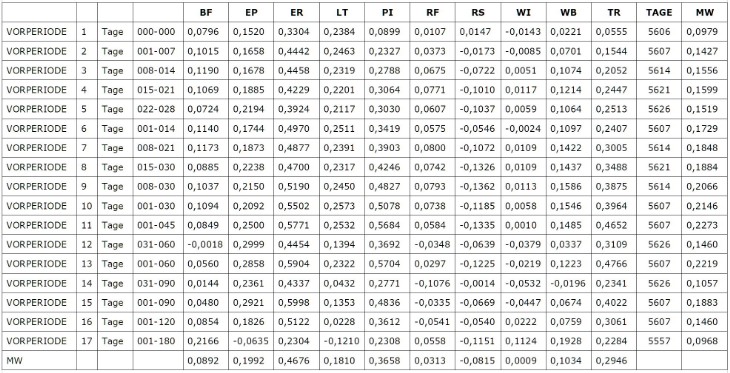 Für diese Gleitmittelbildung können beliebige Perioden vor dem aktuellen Tag verwendet werden. Für erste Untersuchungen wurden insgesamt 21 Vorperioden definiert (siehe Tabelle oben rechts). „Tage" bezeichnet die Tage vor dem aktuellen Tag, die für die Gleitmittelbildung herangezogen werden, also z.B. 001-