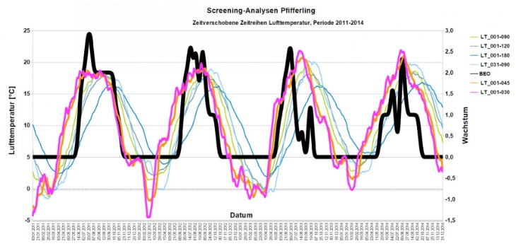 Zeitverschobene, geglättete Tageszeitreihen des Parameters LT=Lufttemperatur, dargestellt zusammen mit dem beobachteten Wachstum für Pfifferlinge (Periode 2011-
