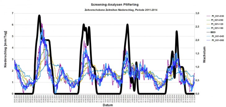 Zeitverschobene, geglättete Tageszeitreihen des Parameters PI=Niederschlag, dargestellt zusammen mit dem beobachteten Wachstum für Pfifferlinge (Periode 2011-