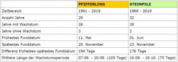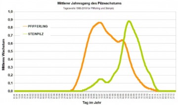 Die Abbildung unten rechts zeigt den für die jeweilige Gesamtperiode auf Tagesbasis berechneten mittleren Jahresgang des Pilzwachstums für die beiden untersuchten Pilzarten Pfifferling und Steinpilz. Deutlich zu erkennen sind die unterschiedlich langen und gegeneinander verschobenen Wachstumsperioden.