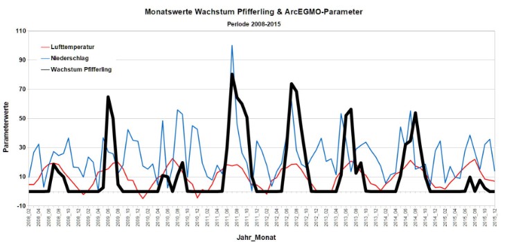 Um mögliche Zusammenhänge zwischen dem beobachteten Pilzwachstum und den meteorologischen Parametern grafisch zu veranschaulichen, sind nicht die stark fluktuierenden Tageswerte, sondern Monatswerte die geeignete Grundlage. Deshalb sind in der folgenden Abbildung die zu Monatswerten aggregierten Werte des Pilzwachstums für Pfifferlinge sowie die auf Monatsbasis aggregierten Parameter Lufttemperatur LT (Monatsmittelwerte) und Niederschlag PI (Monatssummen) des Modells ArcEGMO dargestellt (Teilperiode 2008-